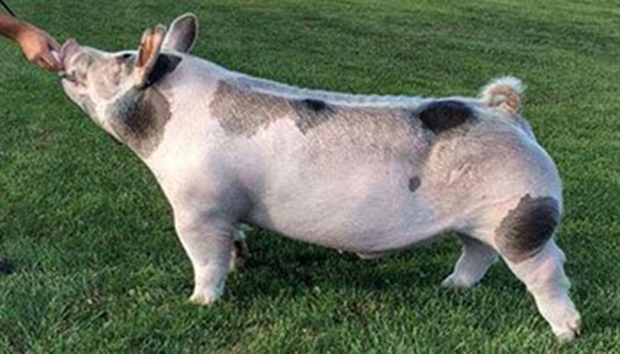 Few firms are more synonymous for success and high profile females than Winmor Farms. Lots of high caliber show gilts find their home in Iowa under the care of Ron, Jennifer, and the crew once their show ring days are done. As their saying goes “Home of the nations most talked about females,” the powerful sow base is the key to the highly sought after showpigs produced there. Along with their strong genetic base and potent sires available, their ability to produce big time sire candidates is evident too. Prior to Indiana, they posted a calico boar that grabbed our attention along with many others. Fast forward to the Crossbred Classic and this one lived up to the hype! At the end of the show he was on our short list to own. It took $20,000 to lock this one up but we couldn’t be more excited! A big thank you to Dennis Wooden on his contribution to own part of this one along with Winmor retaining interest in him as well. Red Eye is an impressive boar to view in person and lives up to what you’d expect with his pedigree. Sired by Red Sky, the Sky’s the Limit son at Upperhand, and out of a Visionary X Triple Crown dam. The mother of Red Eye was the Champion Git at the 2017 WPX shown by Colt Wolf. The boars embedded deep through this ones pedigree should only solidify his generating power. Red Eye is a creature to study. Awesome built from the side being tall fronted and level from the profile. Great looking up front with a stout head that has ideal extension. Big legged and heavy boned at the ground. Square and opened up at the ground with impeccable range of motion. The squareness and flexibility to his hind leg is awesome. Big ribbed and pliable center with great shape and muscle. This one is a legit headliner of a sire that must be used. A color that will get you noticed with a phenotype to love. Stare the competition in the face with Red Eye!!!